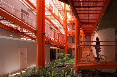 El proyecto ubicado en Donado-Holmberg tiene una rampa color naranja para bicicletas y permite ingresar hasta cada una de las unidades pedaleando desde la calle. Gentileza Javier Agustín Rojas