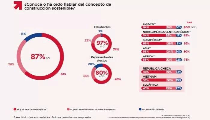 Por otra parte, la sensación de estar familiarizado con el concepto «construcción sostenible» es mayor entre los estudiantes (el 74% dice comprender bien en qué consiste) y el público europeo (64%), especialmente en Suiza, Francia, Alemania y España.