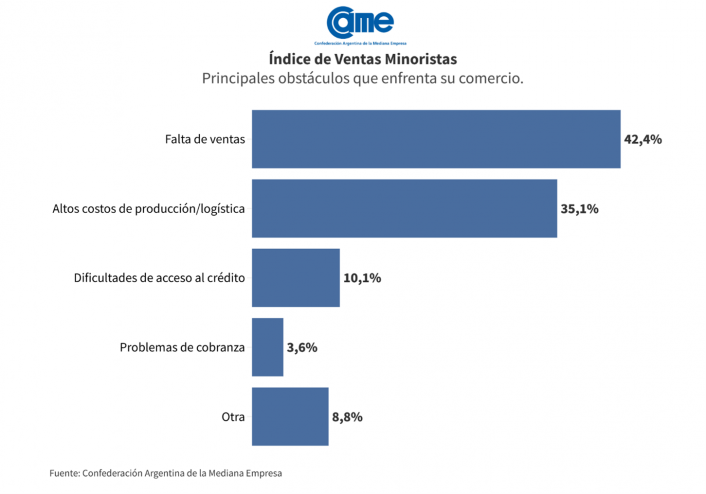 Al momento de mencionar los obstáculos que enfrenta la pyme, en diciembre el 42,4% sugirió la falta de ventas. Cabe destacar que en el Índice de Ventas Minoristas de noviembre 2024 el 50,6% de los comerciantes identificó a la falta de ventas como el principal obstáculo. Por otra parte, durante el último mes del año pasado el 35,1% reconoció a los altos costos de producción y logísticos como problemática, el 10,1% se refirió a las dificultades para acceder al crédito y el 3,6% a los inconvenientes de cobranzas.
