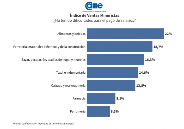 En cuanto a la capacidad para cumplir con el pago de sueldos durante diciembre, el sector de Alimentos y bebidas fue el que tuvo más dificultades en diciembre, con un 22% de los comercios indicando problemas, seguido por Ferretería, materiales eléctricos y materiales de la construcción, donde el 18,7% reportó inconvenientes. En el extremo opuesto, el sector de Perfumerías fue el que menos problemas tuvo, ya que sólo 6,5% tuvo dificultades.