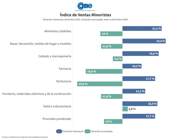 Así surge del Índice de Ventas Minoristas Pymes de la Confederación Argentina de la en Mediana Empresa (CAME), elaborado en base a un relevamiento mensual entre 1.262 comercios minoristas del país, realizado entre el 2 y el 3 de enero de 2025.