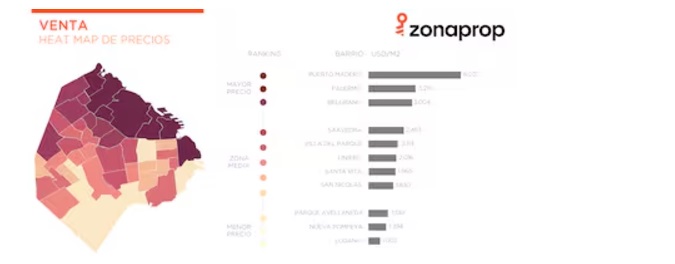 Si el análisis de los precios se lleva a cada barrio, Puerto Madero continúa siendo el que defiende los valores más altos, con un metro cuadrado promedio de US$6021. Siguen en el podio Palermo y Belgrano, con precios medios de US$3215/m² y US$3004/m², respectivamente. Del otro lado, Lugano cuenta con los valores más bajos, con un precio medio de US$1007/m², seguido por Nueva Pompeya (US$1394/m²) y Parque Avellaneda (US$1510/m²).